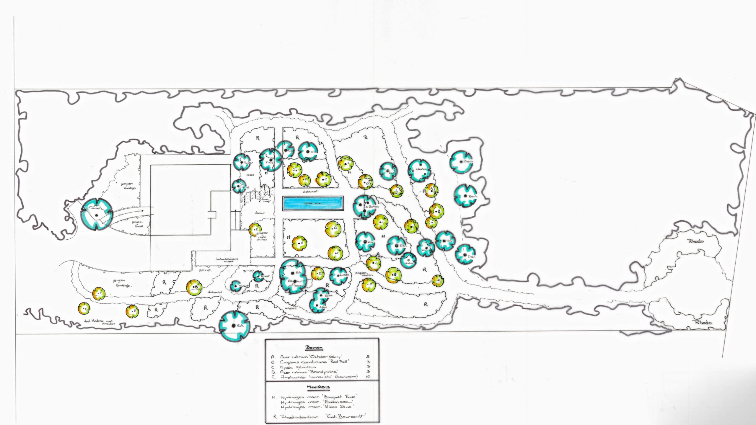 Omdat ik zelf een bostuin heb vind ik het erg knap hoe je een verbinding hebt gemaakt met deze strakke vijver. Wat ik daarnaast een eye-opener vind is de beplanting met vele hortensia’s! Sprookjesachtig! gedurende een ruime periode. Verder ken ik de beplanting niet, maar ik neem aan dat je in deze bostuin veel voorjaarsbollen aanplant .